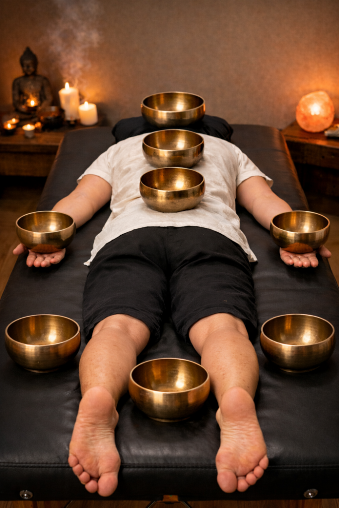 Les bols tibétains sont placés autour et parfois sur le corps, tandis que les gongs thérapeutiques viennent soutenir le processus de relaxation profonde.